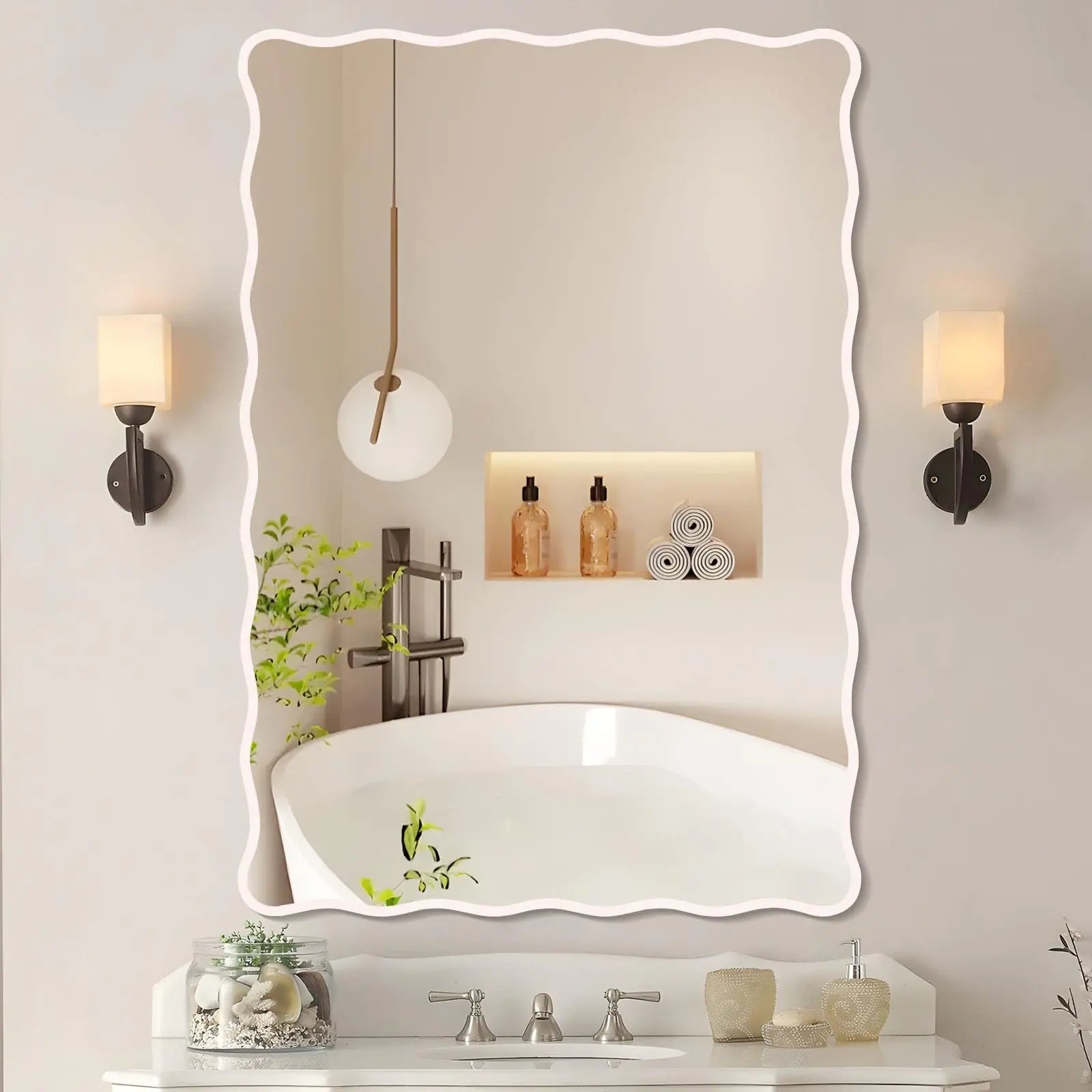 FUWU HOME White Wavy Bathroom Mirror 28" x 40" Rectangle Scalloped Mirror for Wall Decor Bathroom Vanity Bedroom Living Room Entryway (White)