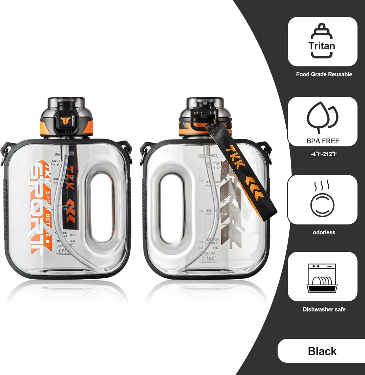 TKK Half Gallon Water Bottle Jug with Straw, Large Capacity Plastic Water Bottle, Dishwasher Safe, 1/2 Gallon 64 Oz, BPA Free Tritan for Gym, Yoga, Travel, Camping, Outdoor, Black